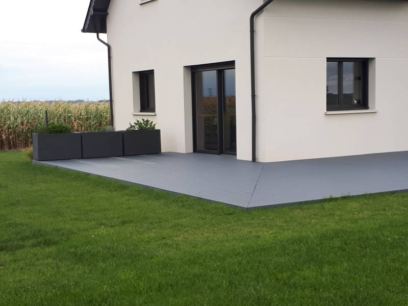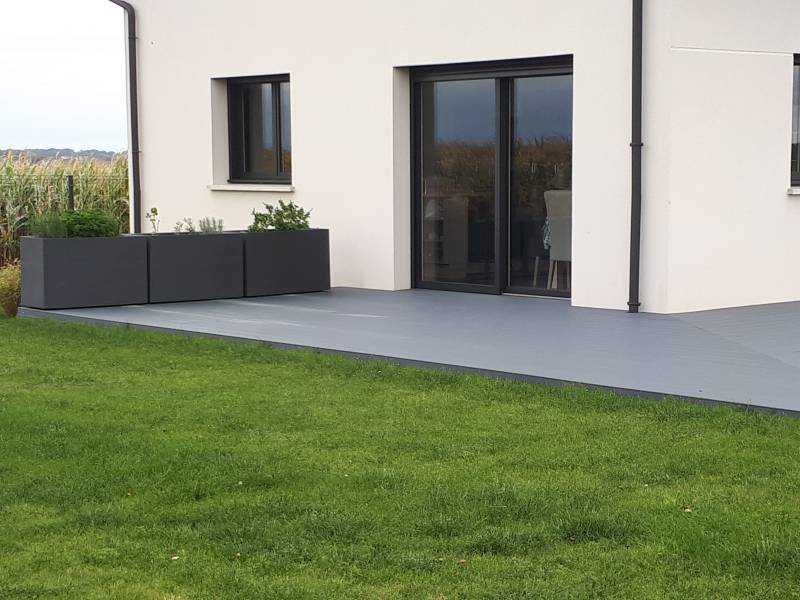 La menuiserie Paris Gilles a récemment réalisé une terrasse sur mesure en composite, coloris gris anthracite, à proximité de Fécamp.